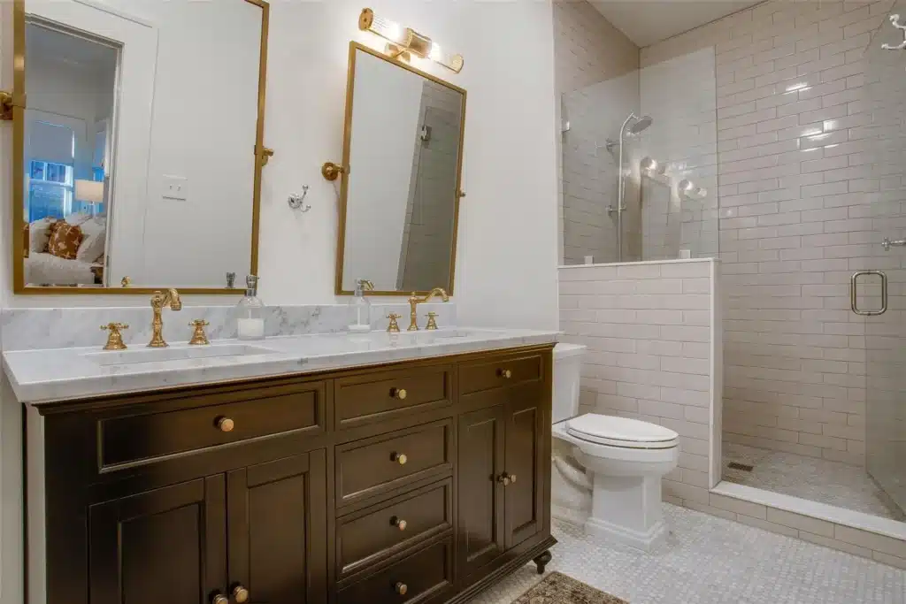 According to Andrews, the sellers reconfigured the primary en-suite bath. With dark-stained cabinetry, white tile, and beautiful brass fixtures and hardware, they paid a fabulous homage to the home’s historic aesthetic. “They did such a good job of marrying the history and character of the home with their updates,” she said.