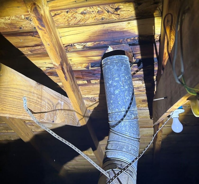 In the video, Inspector Adrian also finds grey ductwork, a material that is no longer used because it is known to disintegrate over time. He makes note of some previous damage from wood-destroying insects and shows us where the furnace flue is exiting the attic in direct contact with wood, which we’ll talk more about below. Next, he finds a dryer vent that has become disconnected, and instead of venting to the outdoors, is blowing lint and hot, humid air into the attic.