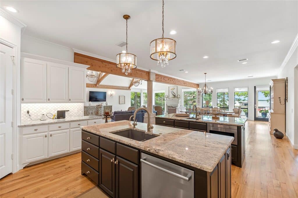 The chef’s kitchen features not one, but two islands, a gas cooktop, double ovens, sleek granite countertops, and a convenient walk-in pantry.