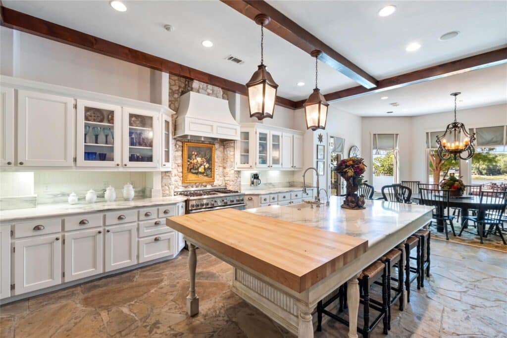 Inside, the home is a showcase of elegance and craftsmanship, including lofty ceilings adorned with intricate wood beams, wood floors, stone-paved floors and accent walls, and two stone fireplaces. The residence offers three living areas and six ensuite bedrooms, providing ample space for relaxation and guests. A vast walk-in attic offers additional storage space and has been pre-plumbed for a bathroom, allowing for the potential of additional living quarters.