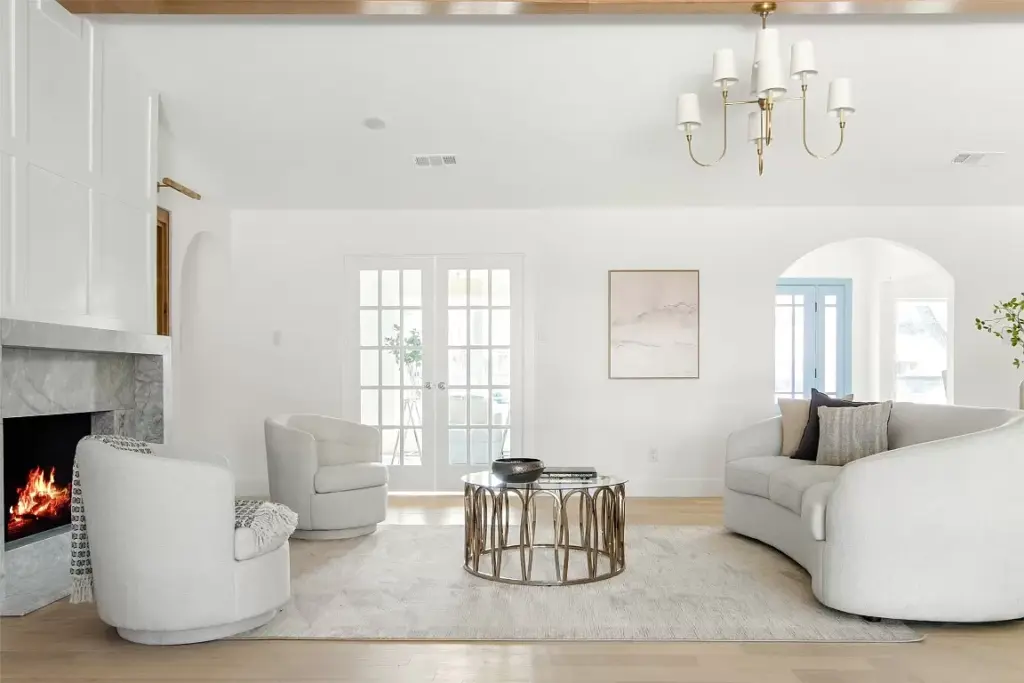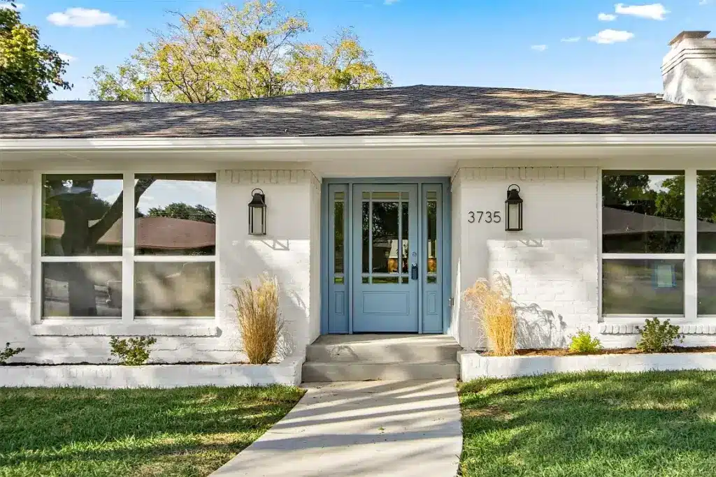 The bright aqua door is the first clue that something special is beyond. This 1968 house has been transformed with an open floor plan made for entertaining. White oak flooring and natural light are part of the appeal, as are the on-trend color palette and luxurious fixtures.