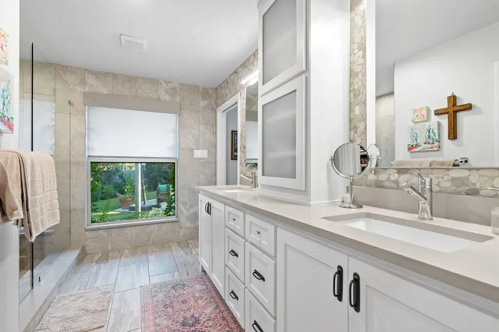 Then, the ensuite bathroom is elegant and updated, featuring a beautiful walk-in shower, dual vanities, and gorgeous marble tilework.