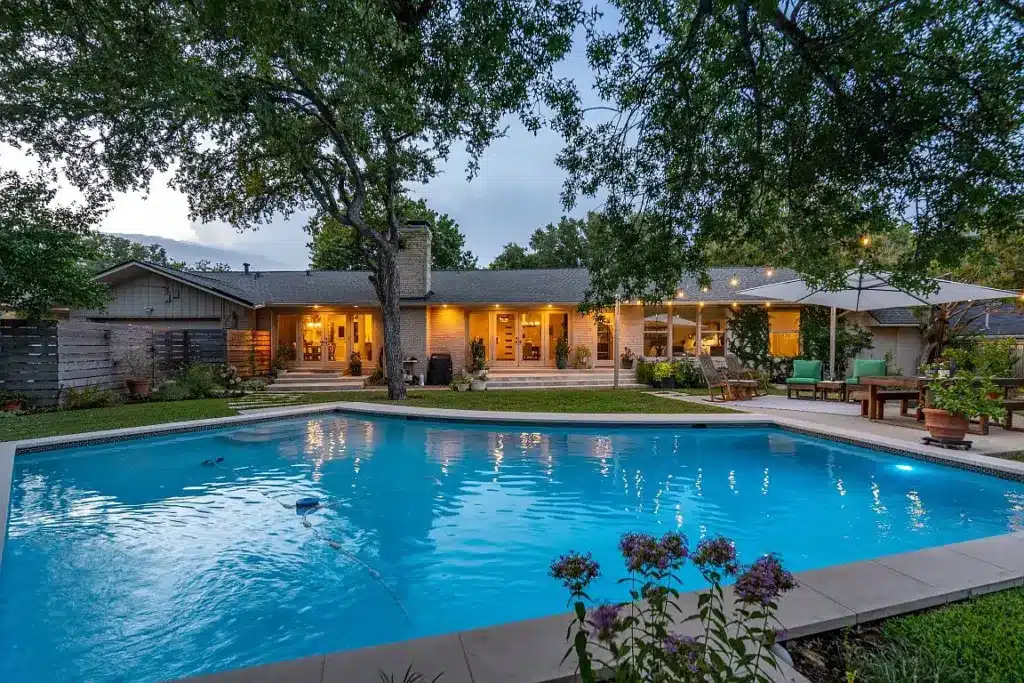 First, the curb appeal of this home is as classic as it is creative. With a partial stone façade, hanging exterior lights, and a low-pitched roof, it’s an ode to early ’60s architecture.