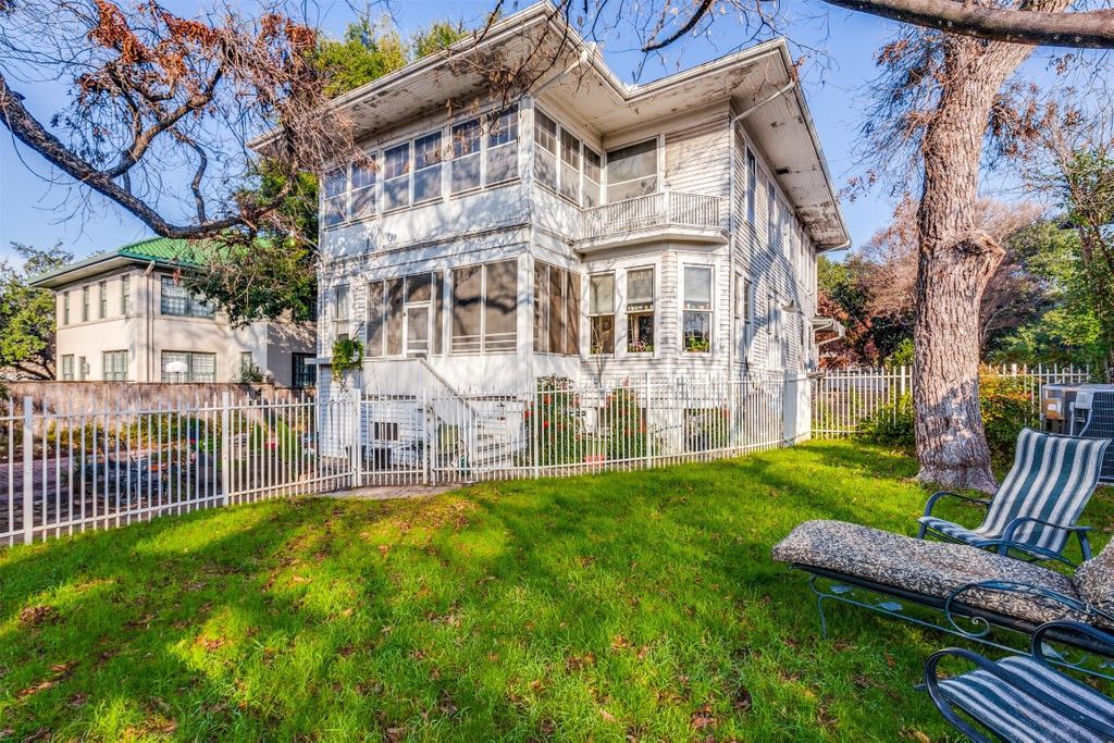 The fenced-in backyard has alley access and a detached two-car garage or carriage house with an apartment.