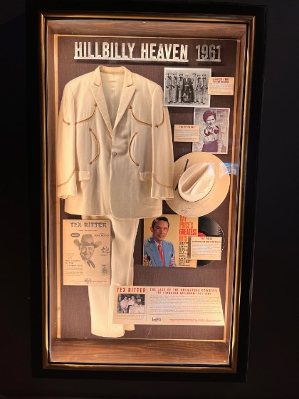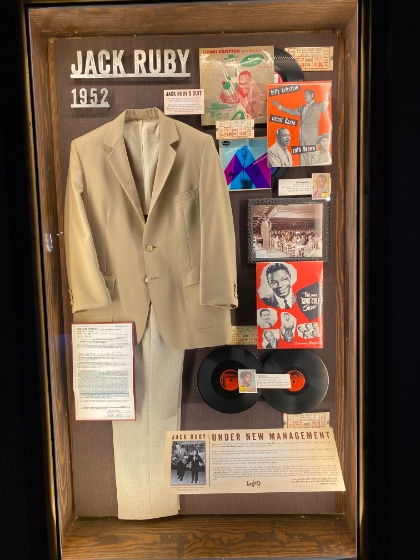 The concept was to create 12 thematic cases. The country western years had to be represented because the Longhorn Ballroom was originally built by O.L. Nelms in 1950 to host his pal Bob Wills and The Texas Playboys. Jack Ruby leased it briefly because Wills was on the road for much of the year. It was challenging to work Ruby into the collection, but he is integral to the era, so his white suit is off to the side of the main collection.
