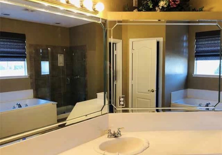 I don’t hate the proportions of the master suite, but it’s definitely time to get rid of the wallpaper, carpet, and light fixtures. And I’m on the fence about that exposed brick, too.