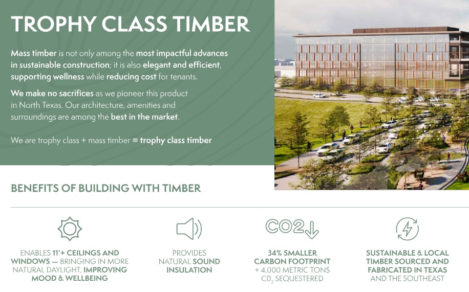 According to a news release, with more than one million square feet of office space slated within the development, this first office building will bring 235,000 square feet of “innovative, differentiated, highly amenitized, and environmentally friendly office space in seven stories of the first mass timber construction in North Texas.”