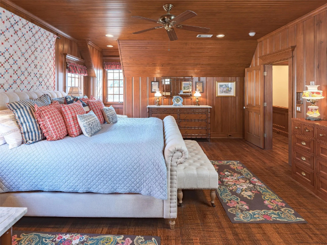 Turney designed the home with three bedrooms, three bathrooms, and two half-baths. The game room will be a hit with the kids, and everyone will want to hang out in the morning room and open-plan kitchen. A cozy wood-paneled study with another stone fireplace will also have film companies knocking at your door because it’s an ideal spot for Christmas ads (which are always filmed in the summer BTW!).