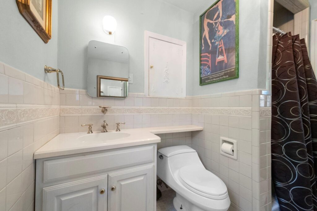Though some may enjoy the vintage quirkiness of the kitchen including the floor and the Formica countertops with metal edging, many will long for a modern makeover. On the plus side is the room’s spaciousness, with cabinet boxes that go all the way to the ceiling.