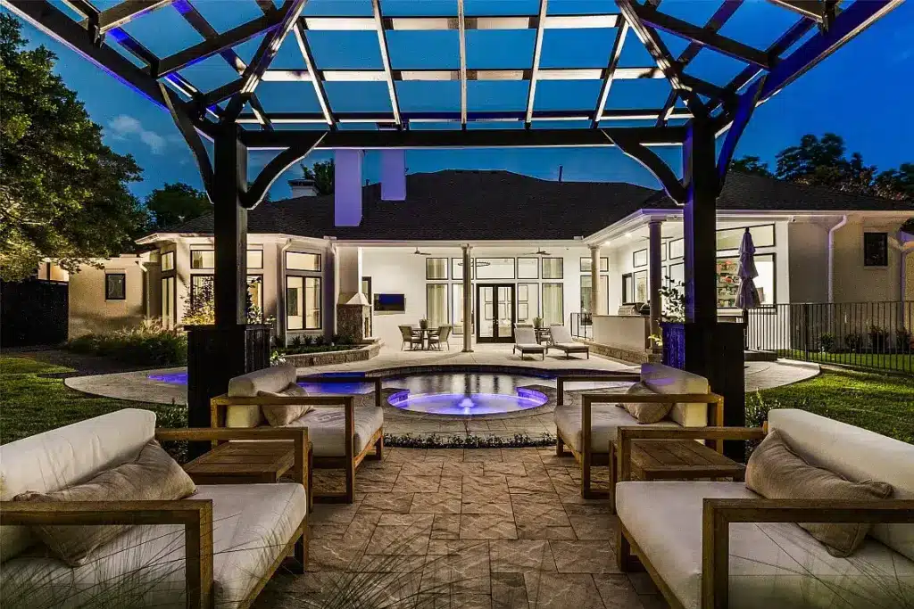 Finally, the backyard presents a perfect escape. A palatial poolside oasis awaits as soon as you step outside. It’s all expertly lit with whole-property illumination. It’s literally a glowing example of the greatness in Bluffview.