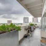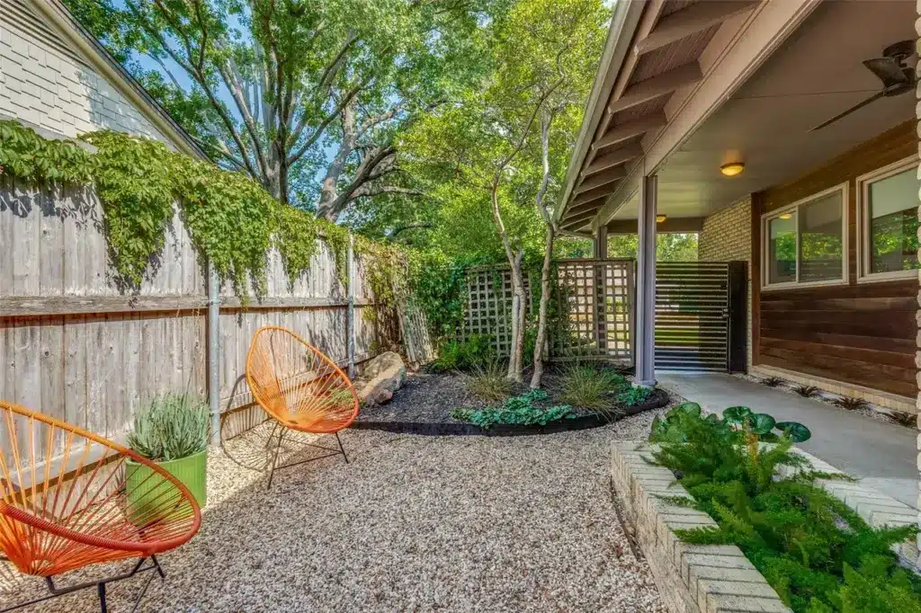 Also notable, the Corten steel fence in front and a little peek of it in the stone in the back. There are fountains in the front and the back to capture that cool, East Dallas laidback vibe. A gated walkway just adds a little something, too. The gate serves a purpose, too. It’s the entrance to a nice little, low-maintenance side yard with seating. And that just adds to the entertainment aspect of this house – so many places to gather.