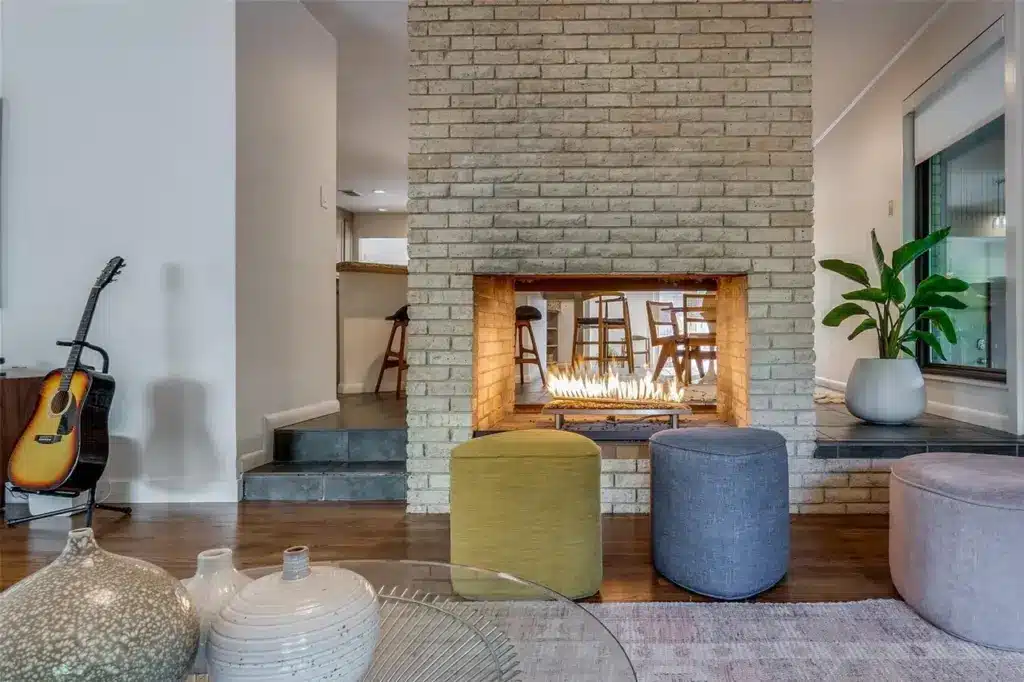 Rice said not only does this house have great energy, it has many of the architectural hallmarks that make it a Ju-Nel. The first one you’ll notice is the two-way fireplace. This see-through hearth made of blond brick anchors the HUGE living room, open kitchen with breakfast bar, and breakfast nook. It’s a big open space that lets party-goers wander from one room to the next with the easiest of ease.