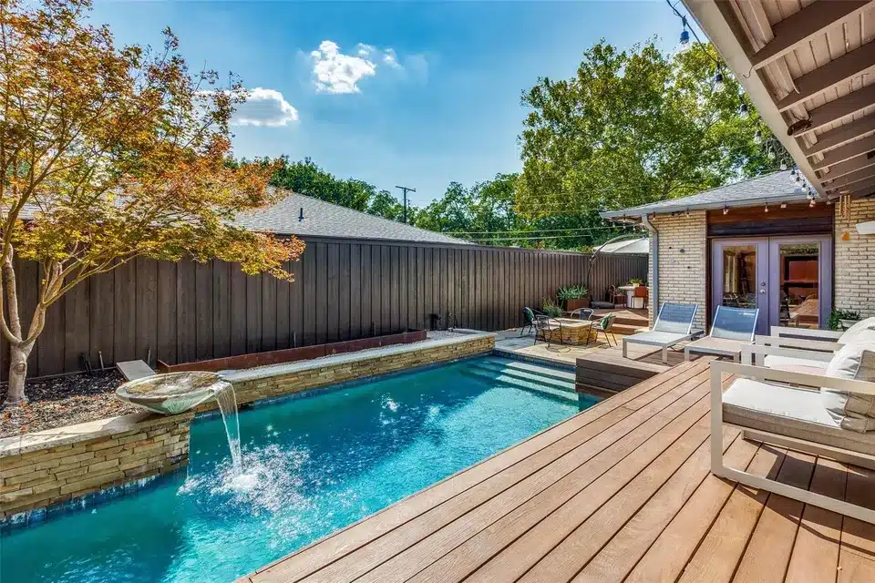 Of course, the deck is incredible. There are levels, y’all, and it’s like a freaking resort out there. The cedar deck leads right up to the pool, and off to the side there’s a firepit with seating. Stacked stone lines the other side of the pool and there is just enough greenery to create an oasis, but not clog your pool filter.