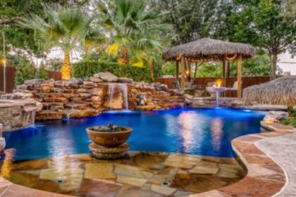 This is no ordinary backyard. There’s over an acre, a basketball court, a diving pool, a separate hot tub, and multiple covered patios.
