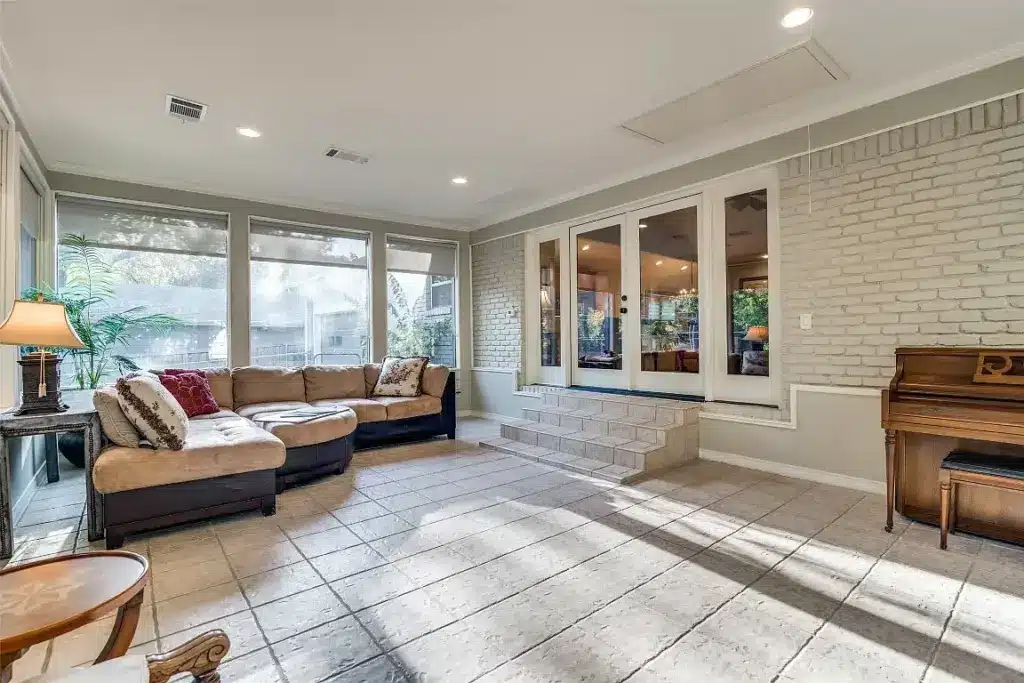 Finally, the backyard is a spacious outdoor destination. With a covered porch that extends from the sunroom, entertaining could not be more dynamic.