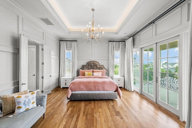 The primary suite of 5160 Peach Willow Lane is of course spa-like and relaxing with a private balcony to enjoy a morning coffee.