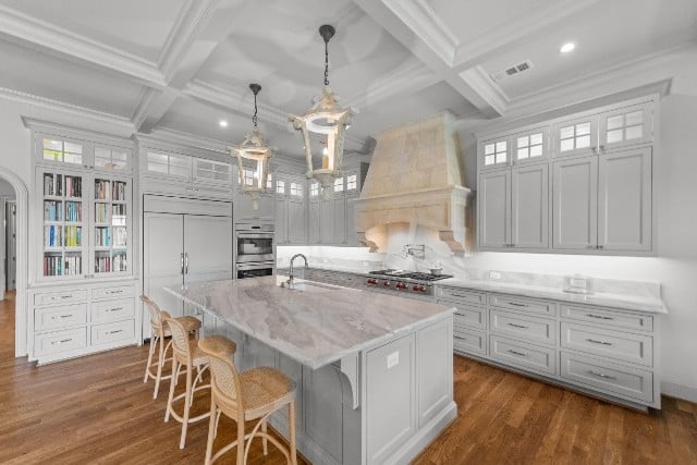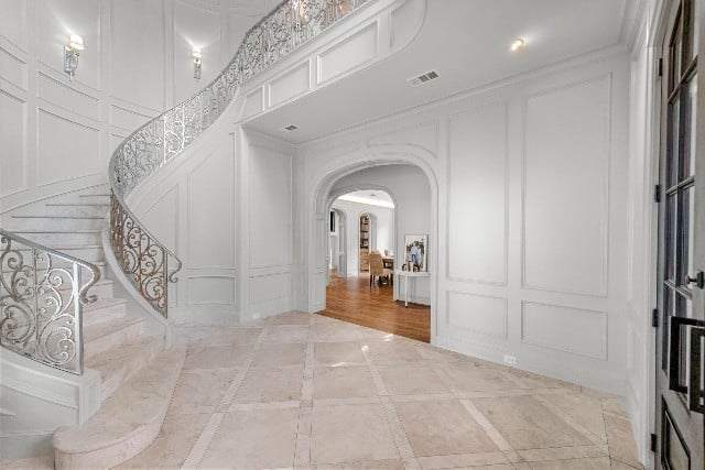 The attention to detail is apparent not only when you approach the home but also when you step foot inside the foyer and see the grand marble staircase. From craftsmanship in the paneling and coffered ceilings in the study to the barrel-vaulted ceiling in the dining area, this home certainly showcases the quality of builder expected in this neighborhood and at this asking price.