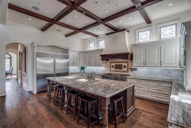 One is undoubtedly the open-plan family room. Although it’s dramatically vaulted and beamed and is anchored by a large fireplace with an antique French surround, it has a surprisingly intimate feeling. The wall of divided-light windows and French doors opens to the covered patio and pool, and that outdoor area is absolutely the second heart of this home.