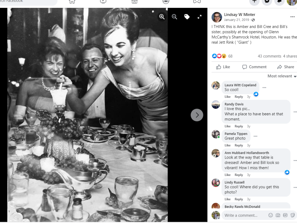 Hill said recently on Facebook, an Abilene resident posted this very glamorous picture of Amber Cree at the opening of the Shamrock Hotel in Houston and shared a story about the Crees home. The poster said one time, father may have been a bit overserved at a party at the Crees’ legendary home and resorted to “climbing to the guest suite by scooting on his butt – he was afraid of going over the edge on the stairs and rail-less landing.”