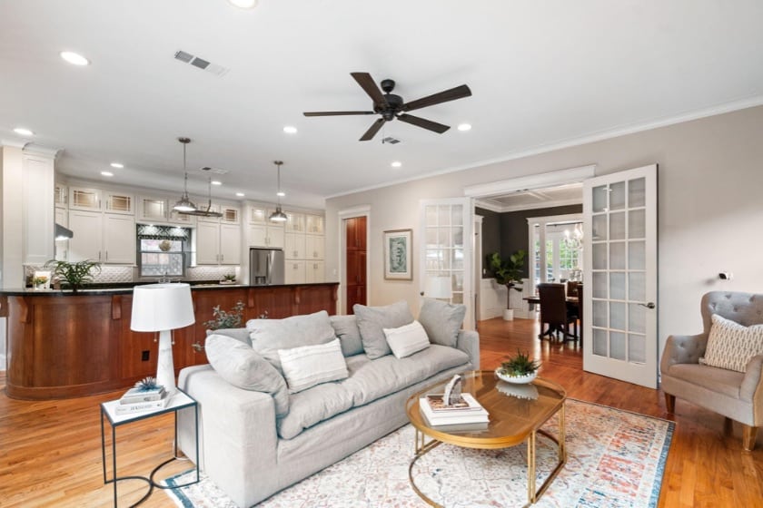 On the inside, since it is newer construction, you get all the perks of today’s design – large rooms and a massive kitchen with all the countertop space and cabinets you’ve ever dreamed of. The kitchen opens to the living room, and then the living room is separated from the formal dining with a set of French doors. It’s that flow that adds to the social feel of the home. It was made for entertaining.