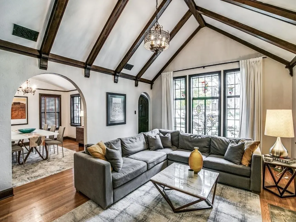 The formal living room has a vaulted cathedral ceiling with stained wood beams bearing the shape of this Tudor’s steep gabled roof line. That steep roof line classifies it as a High Tudor, listing agent Robert Kucharski of David Griffin and Company Real Estate says.