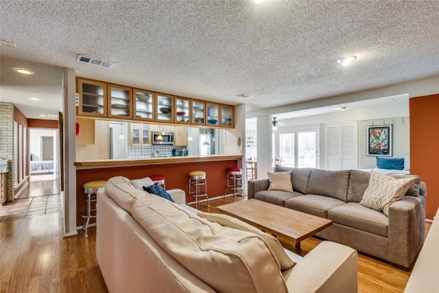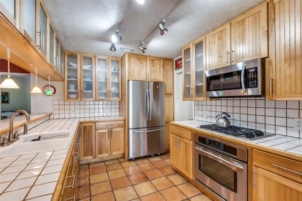 The kitchen was updated in 2017 with all-new custom cabinetry, countertop, and backsplash and the owner hand-laid these surfaces with Mexican tile. It mimics the era and the other original gem – Saltillo tile. If you grew up in Plano, lived in Plano, or ever had the fortune of hanging out at Collin Creek Mall back in the day, there’s a special place in your heart for Saltillo. It paved the way to the food court and the literal creek that ran inside the mall. But enough about a wistful trip down Frulatti way, let’s get back to this house.