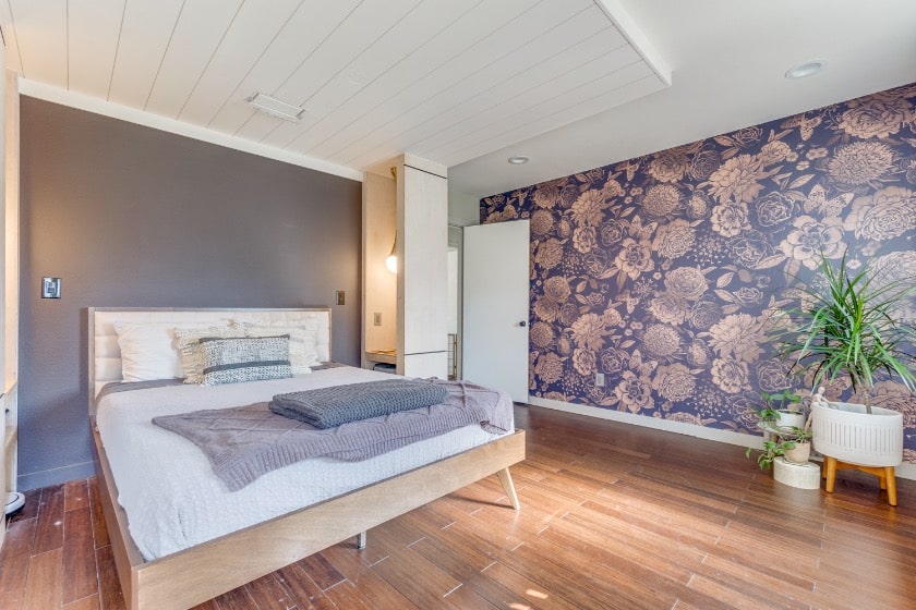 Now it’s time to lose your mind in the primary suite. Before it was a big ol’ long room with a small ensuite bathroom. Then Ortley came along and reconfigured the room…slightly. He borrowed from the closet to create a larger bathroom. He added a partial wall to divide the space and make the room feel cozier – a must for Mabli. On the flip side — leading into the bathroom, there’s a set of built-in drawers and tall cabinets to create an open closet. They dropped the ceiling slightly and created two vertical nooks that serve as nightstands and also make it feel like the room is giving the bed a hug.