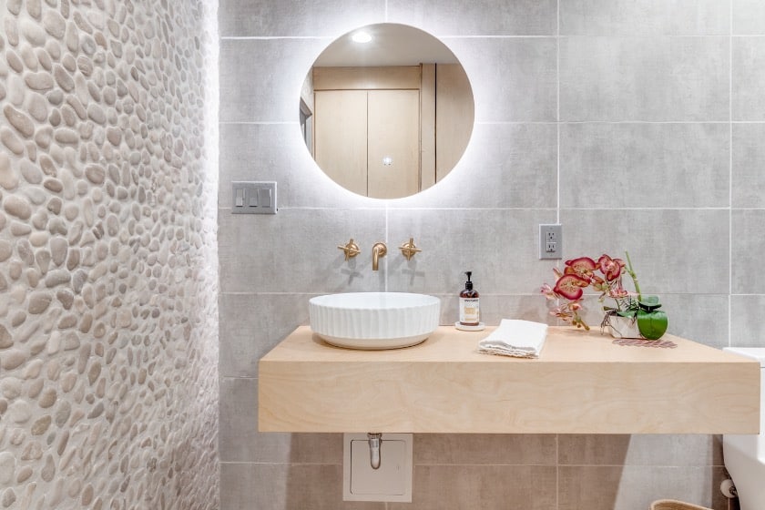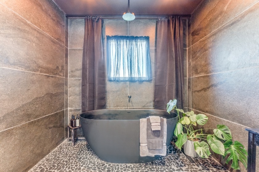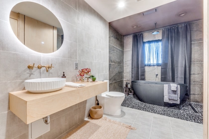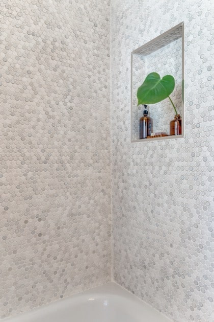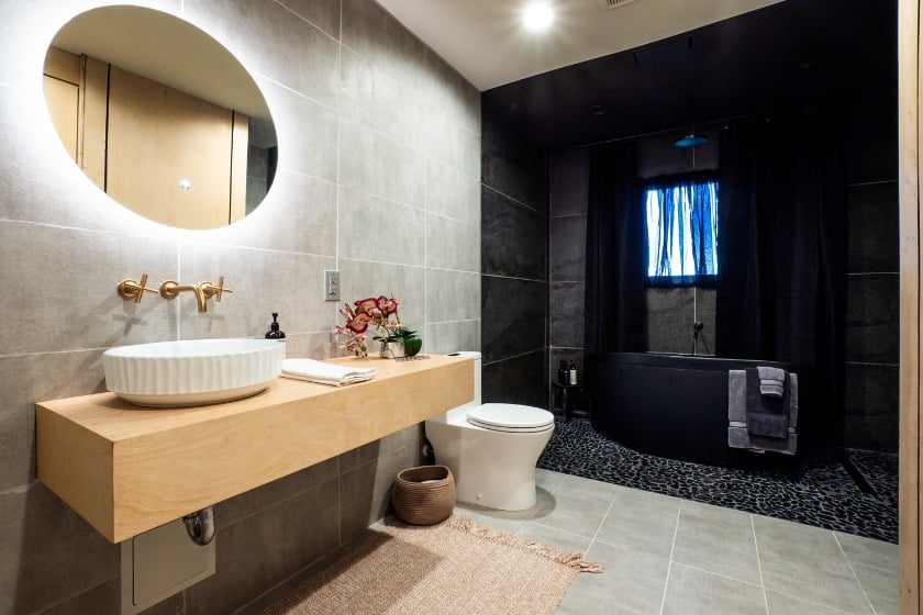 And when she REALLY needs it dark, she simply rounds the corner, heads through a pocket door, and is in one of the coolest freaking bathrooms I’ve ever seen. Especially in person. In the bathroom, Ortley headed up the space design and Mabli headed up picking every single material in there.