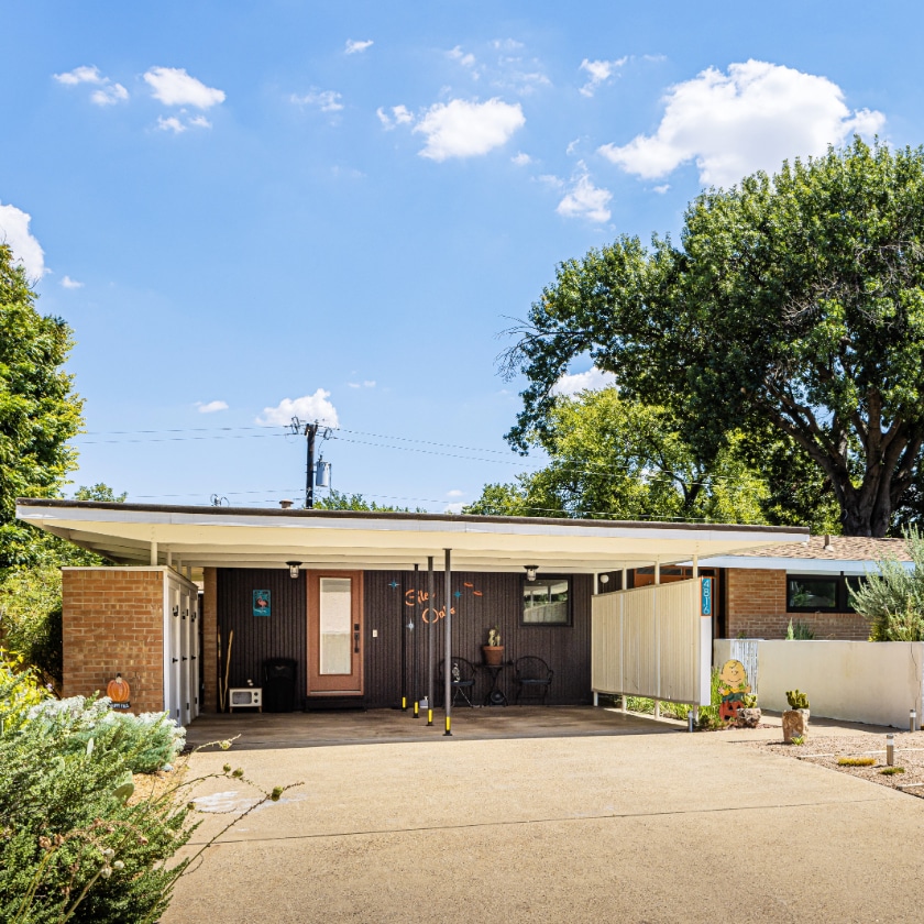 The low-slung house with its minimal carport is a clean canvas and approaching the house reveals the details we appreciate the midcentury for, such as wood screens, exposed rafters with angled tails, and exterior storage closets, all nestled under deep eaves which shade the many windows.