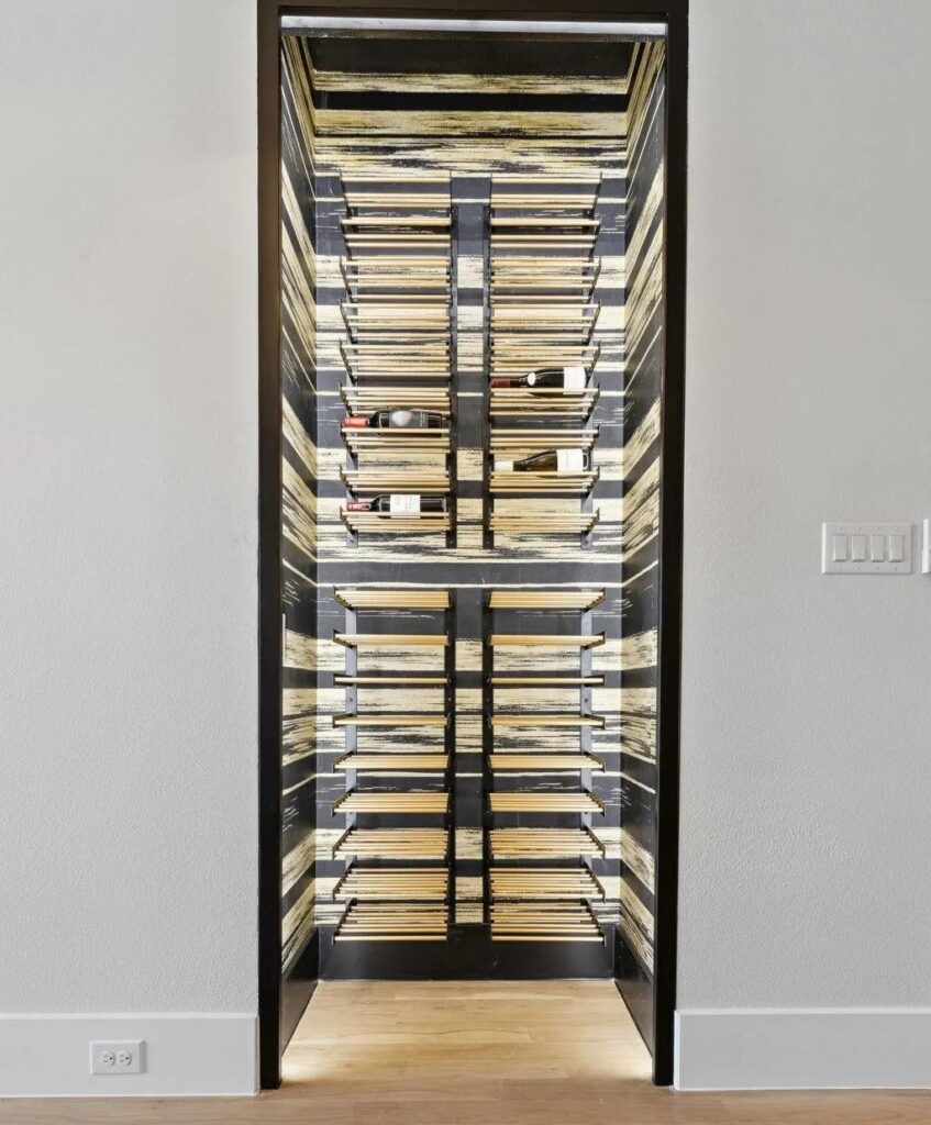 Here’s the modern wine niche. It features custom metal shelving for bottle storage, gorgeous lighting, and a bold black and gold wallpaper I think that admittedly plays tricks on your eyes. It’s located just off the entryway as you approach the kitchen, and the way it glows, this wine closet is like a beacon or more accurately, a siren, calling visitors to it.