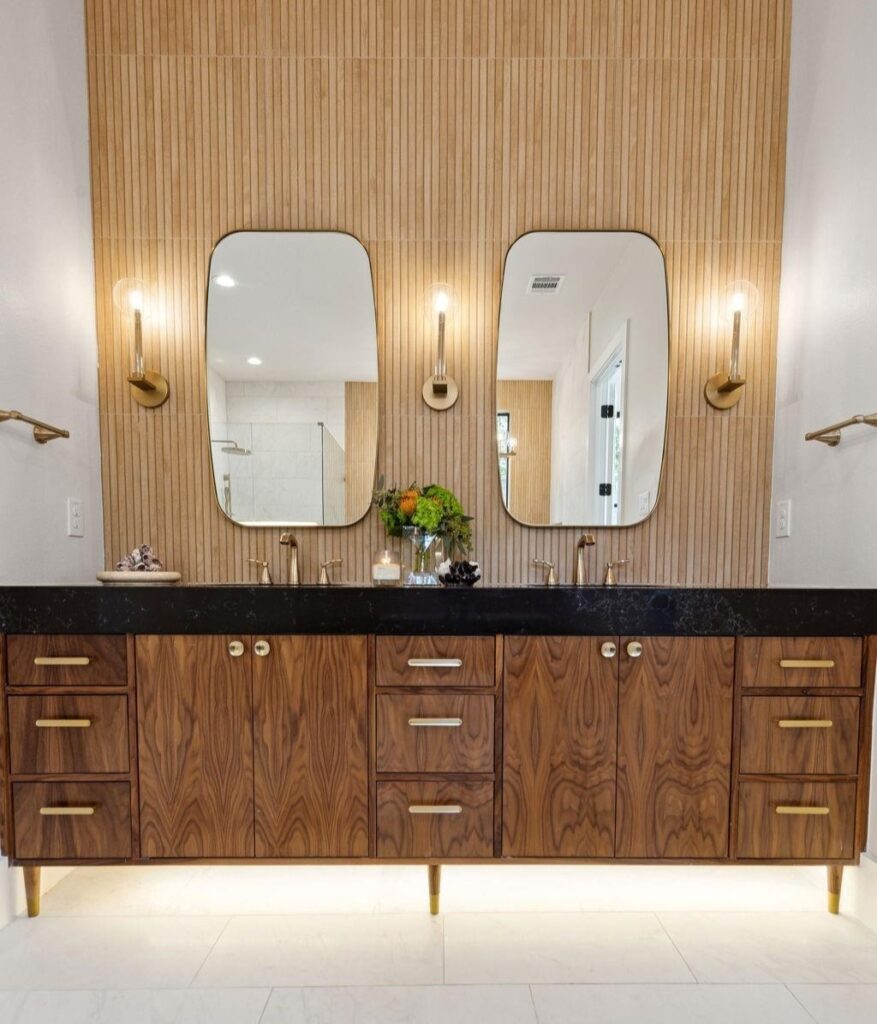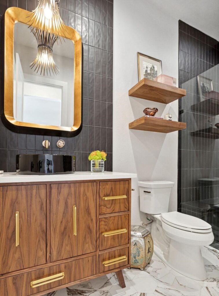 You’ll find brushed gold hardware and muted black quartz tile on the fireplace and bathroom walls laid vertically instead of a more common horizontal pattern. Also, take note of the custom walnut and white oak wood features in the bathroom and throughout the home. That was intentionally prominent, Sandlin says, adding that he’s been excited to bring those walnut wood colors back into the home.