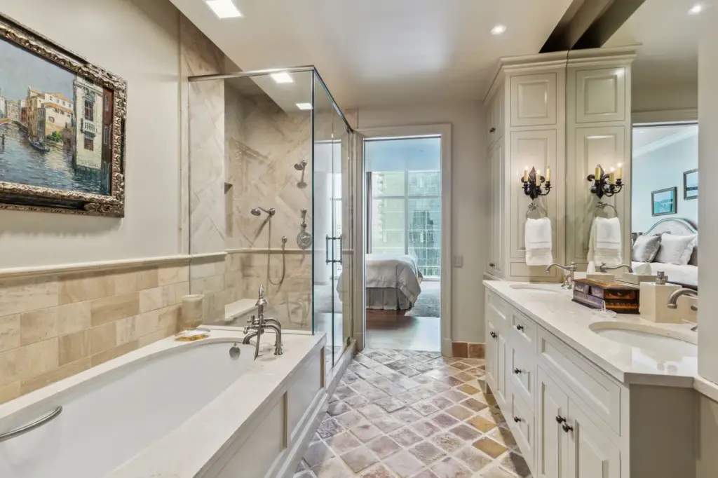 Now, let’s talk about the details because there’s no scrimping on luxury here. You’ll find French Brown custom oak wood floors throughout, and carefully curated materials like limestone, onyx, marble, gem quartzite, and antique hand-hewn Italian tiles throughout the bathrooms and primary suite.