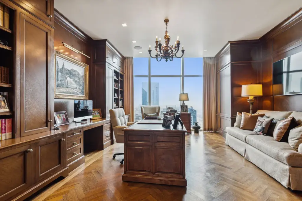The result offers three generously sized ensuite bedrooms, two sprawling living areas, a dining room with a recessed elliptical ceiling, a fully-stacked kitchen, an executive office decked out in walnut, and an expansive 200-square-foot balcony.