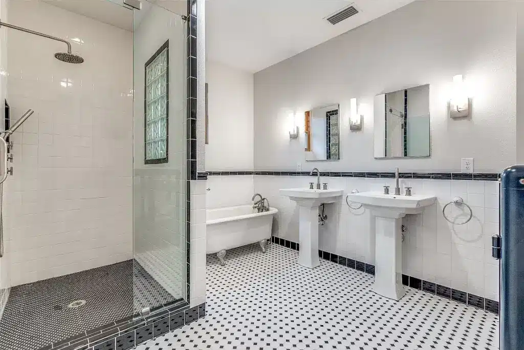 Then, the ensuite bathroom is a design delight. With vintage fixtures, a clawfoot tub, and ornate tilework, the character of this space perfectly complements the personality of this home.