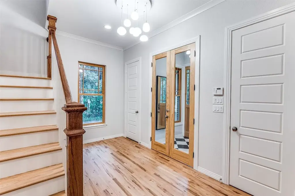 Upon walking in, it’s apparent how inviting this home is. Beautiful hardwood flooring and crisp white finishes follow you throughout. Also, an array of designer fixtures and natural accents give the place tons of personality.