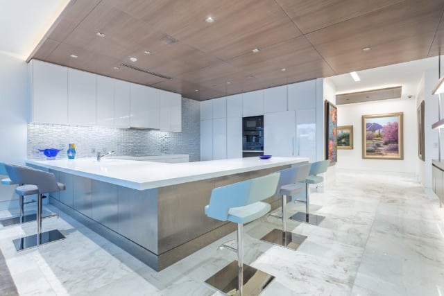 It’s exceptionally sleek and modern and the list of custom details is exhaustive. Throughout the home, you’ll find European cabinetry with bird’s eye maple cabinets and shelves interspersed with silver sycamore, dropped wood ceilings, Kalta Bianco polished marble floors, Source One Exclusive Mirth Pasadena Wall Coverings behind the display shelves, and more.
