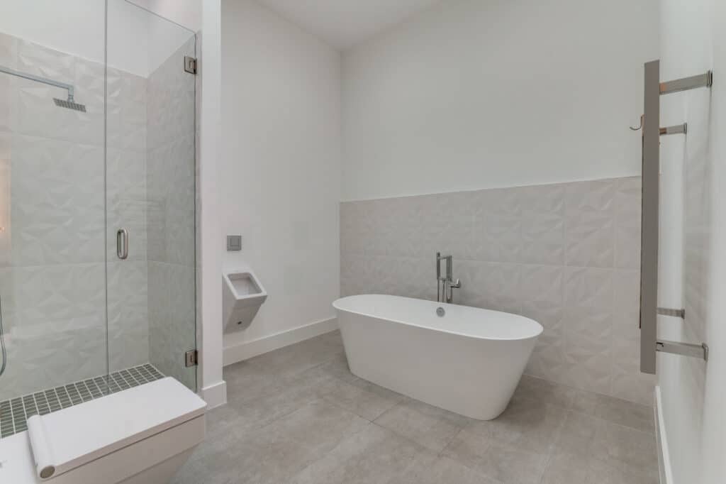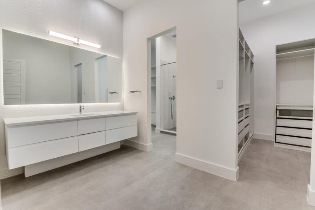 The owner’s suite features fully updated his-and-hers bathrooms. Modern minimalist design and incredible tile work define both spaces.