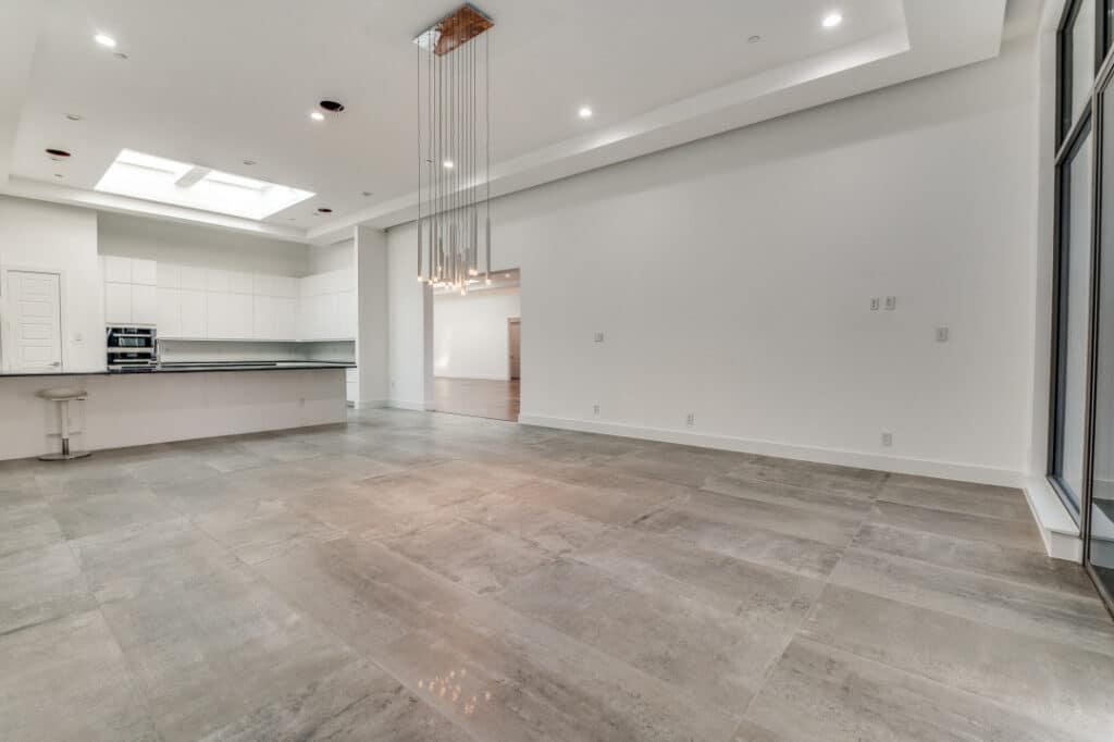 Since this home is all about entertaining, the kitchen here is incredible. Like the rest of the home, it is modern and immense, featuring high-end Miele appliances, endless countertops, and tons of ultra-modern, minimalist cabinetry. Also, it adjoins one of several dining areas — this one with a breathtaking LED chandelier.