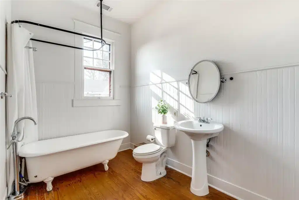 With three bedrooms, two bathrooms, and 1,936 square feet, this is not a small house. But the areas that have been updated weren’t overdone, keeping the scale of this 1945-built Winnetka Heights Craftsman intact. That’s evident in the primary suite, which has an ensuite bath featuring a claw-foot tub and a pedestal sink.