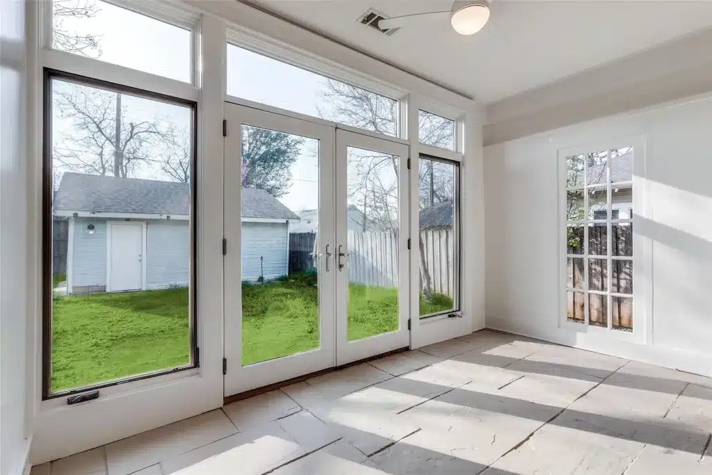 Just through the dining room is a butler’s pantry, and just beyond that is the kitchen, which features rich green cabinets and a fun honeycomb marble backsplash. And just past that is a sunroom with full-light French doors that open to the backyard.