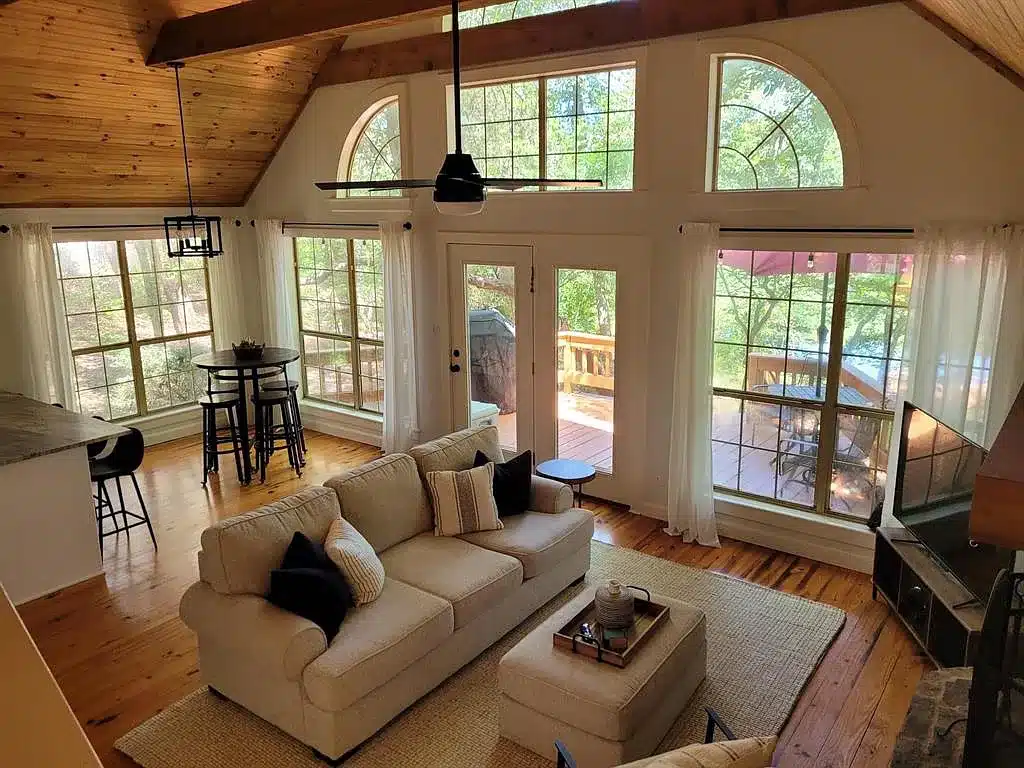 Then, upon walking in, you notice just how open and inviting the space is. Also, it carries that natural feel throughout with cedar-planked ceilings and beautiful hardwood flooring.