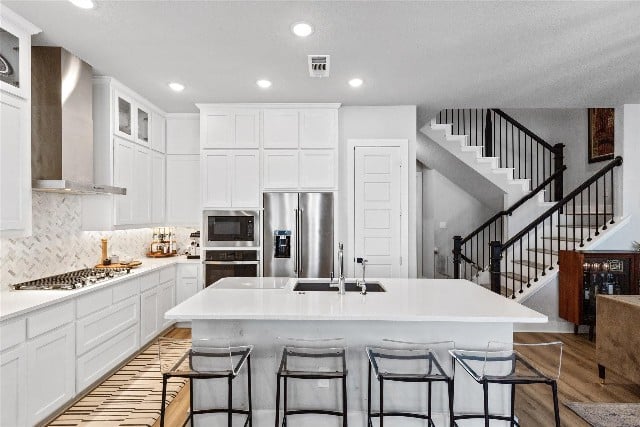 This home is filled with wonderful and stylish selections on every floor. The kitchen features a large island — because that’s where everyone is going to hang out on game day.