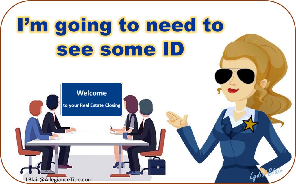 Some title companies will also accept a Foreign ID card, U.S. military ID, or resident alien card with a signature that was issued by the U.S. Citizenship and Immigration Services. However, not every title company is that flexible. It is best to check in advance if one of those documents will be adequate. I’m strict about proof of identity, but I’ve accepted a prison ID that fit the requirements. That’s a story for another day.
