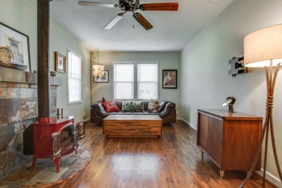 In the living area you’ll find a brand new red Intrepid free-standing wood stove infront of the decommissioned fireplace. This is ingenuity, right here. Not only is a freestanding wood stove more efficient than a built-in fireplace, but I love that the owners have repurposed the hearth, covering it with slate and giving room for the adorable wood-burning stove. If we have another multi-day power outage during sub-freezing weather, this little wood stove will heat the entire 1,122-square-foot structure quite well.