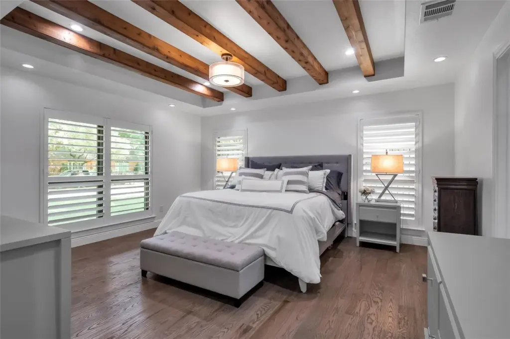 Then she’s got the fun, more right-brained bullet points, like the architecturally coved ceilings, the striking cedar ceiling beams, the designer lighting and plumbing fixtures, and the pristine quartz and marble countertops. She can point out the gorgeous new fireplace, new dry bar, and extensive new custom cabinetry throughout the kitchen, bathrooms, and laundry that’ll justify many, many trips to the Container Store. This is the stuff that lights up the reward centers of your brain and gets you thinking of the possibilities for this two-story home that has dual masters and a backyard large enough to put a pool in. Right. this. minute.