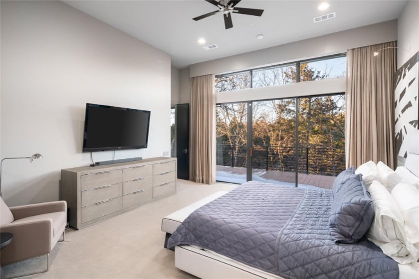 Walls of windows bring nature in and the interior is seriously as stunning as the landscape. White oak flooring, a stacked stone fireplace, open concept, built-in credenza with lights running along the bottom and neutral throughout. Is there a black-and-white theme? Maybe. Keep it going with warm beige or bring in all the pops of color.