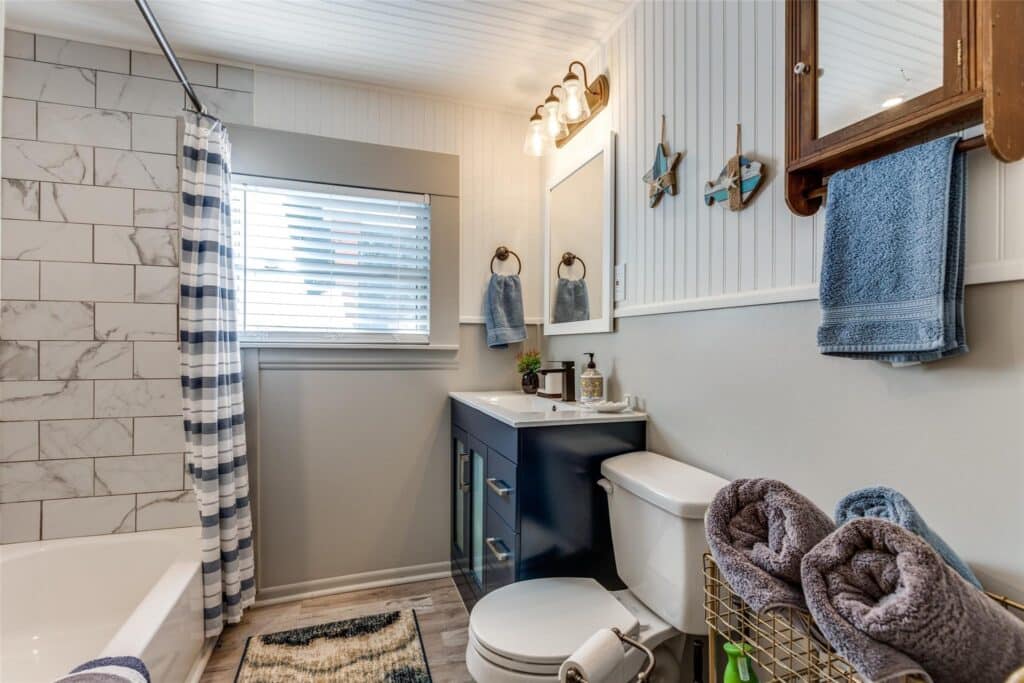 Aside from that it’s all modern with gray walls, marble-look tile in the shower, granite countertops in the kitchen, and luxury vinyl plank throughout. There’s just something about a solid floor. It makes every house feel bigger and this one has warmer tones to complement the cool gray.