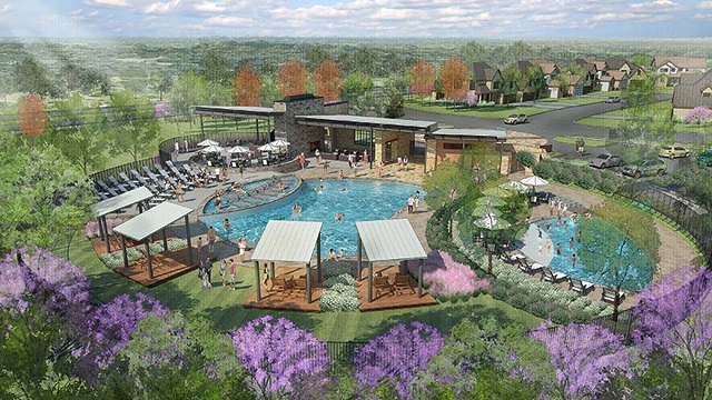 Community amenities include a resident amenity center, which features a clubroom with a kitchen, fitness center, yoga lawn, outdoor living room, a resort-style pool, and a kids splash pad. In addition, there are lounge areas, dog parks, walking trails, and playgrounds spread out across the different neighborhoods in the community.