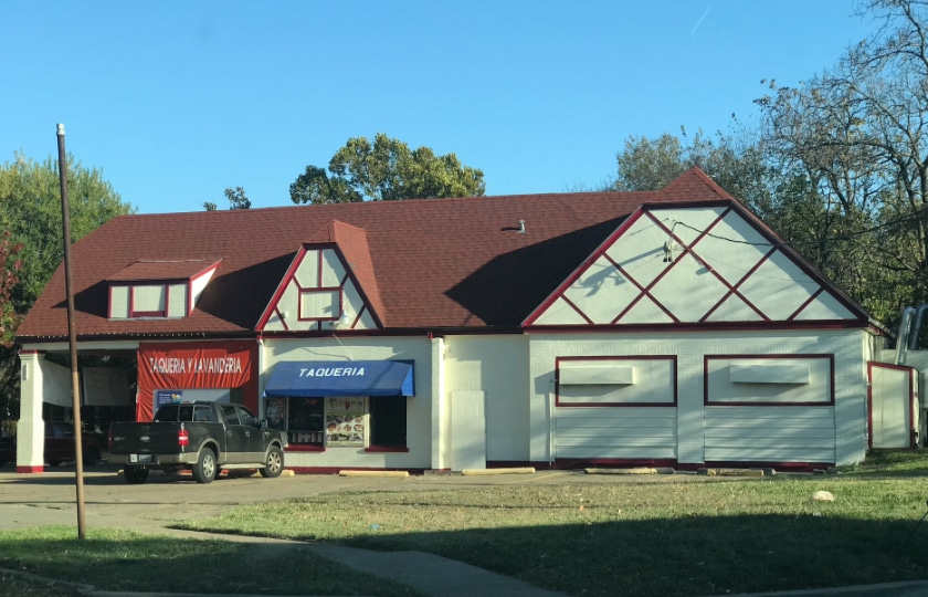 To appease neighbors who were not thrilled to have a service station in their backyard, gas companies adopted a residential building style for their structures, with the only clue as to their purpose being the gas pumps. This one was built to resemble a Jacobean Tudor home.