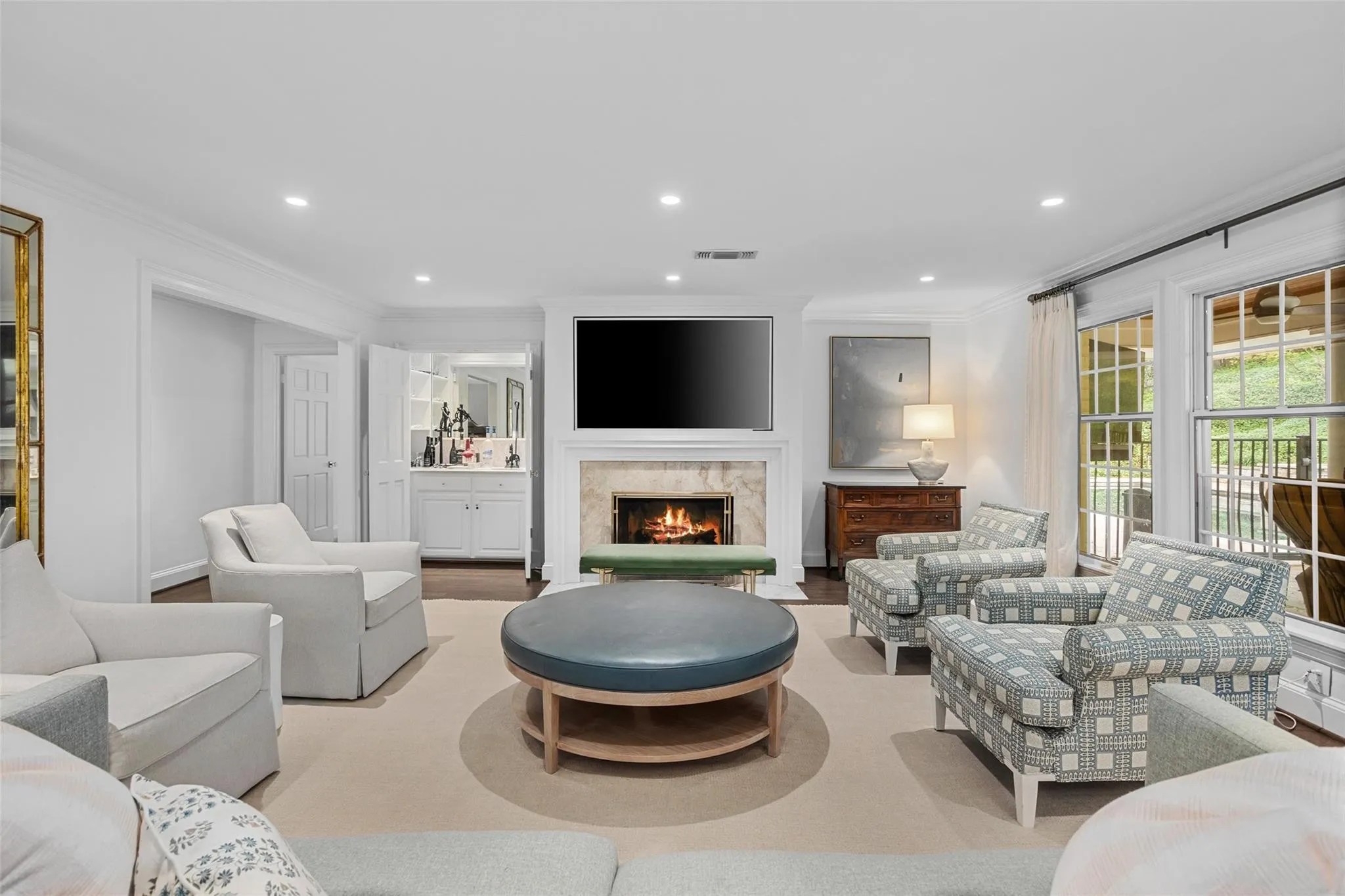 One of the home’s highlights is the gorgeous dining room, featuring an aqua Schumacher wallpaper, a designer chandelier, and a convenient butler’s pantry. The beautiful powder room was spruced up with marble countertops and Phillip Jeffries wallpaper.